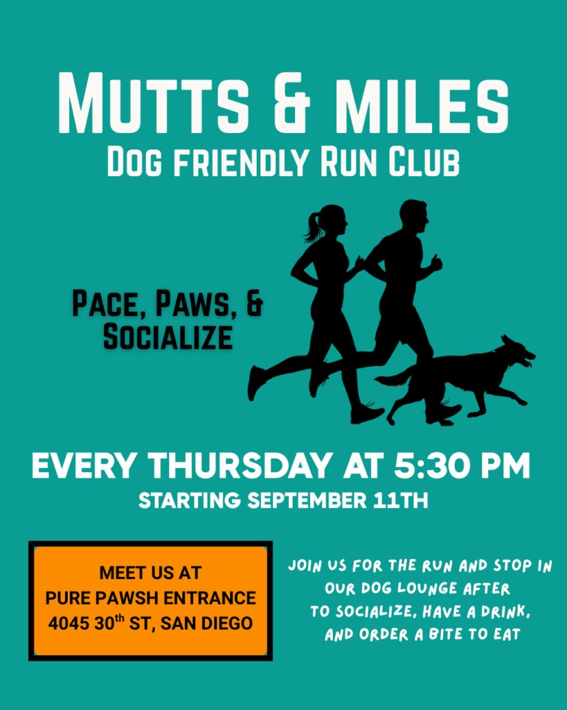 Lace up and leash up! Join us every Thursday at 5:30 PM for a community run that’s all about pace, paws, and connection. We’ll meet at the Pure Pawsh entrance (4045 30th St, San Diego) and hit the streets together before heading back to our dog lounge to unwind. After the run, stick around to socialize, grab a drink, and enjoy bites with fellow dog lovers. The fun kicks off September 11th!